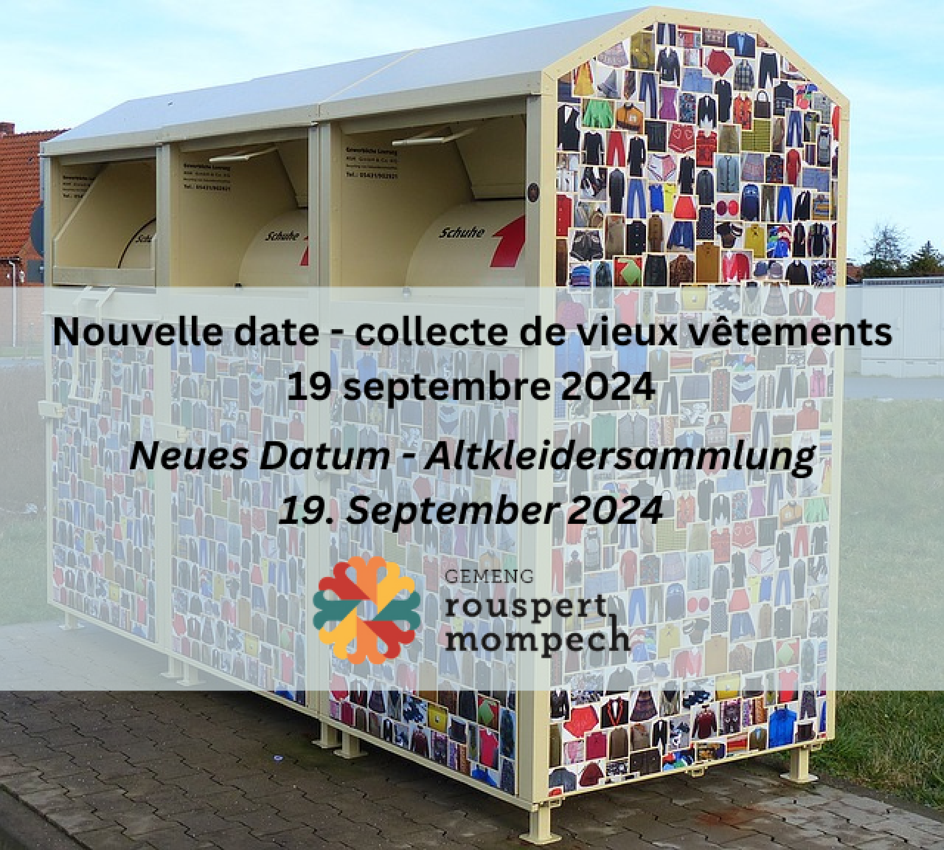Prière de déposer vos sacs avec les vêtements, souliers ou autres textiles, bien emballés, le jour-même sur le trottoir.