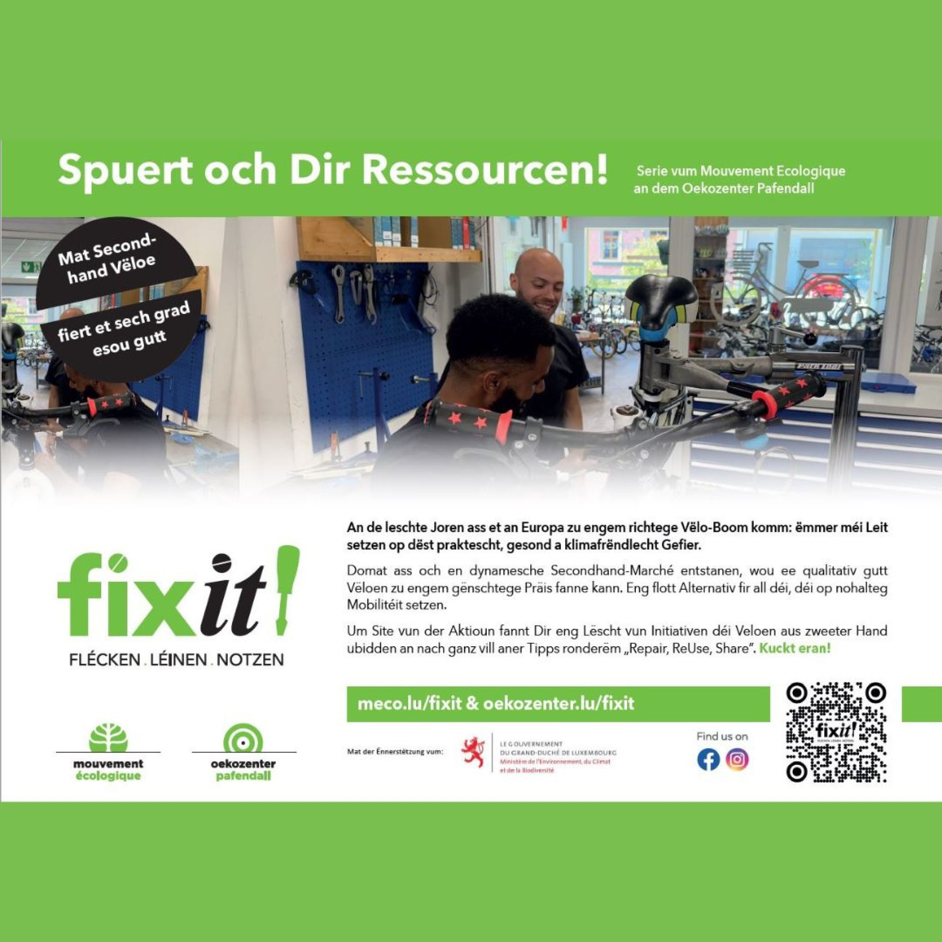 Um Site vun der Aktioun fannt Dir eng Lëscht vun Initiativen déi Vëloen aus zweeter Hand ubidden an nach ganz vill aner Tipps ronderëm "Repair, ReUse, Share". Kuckt eran!