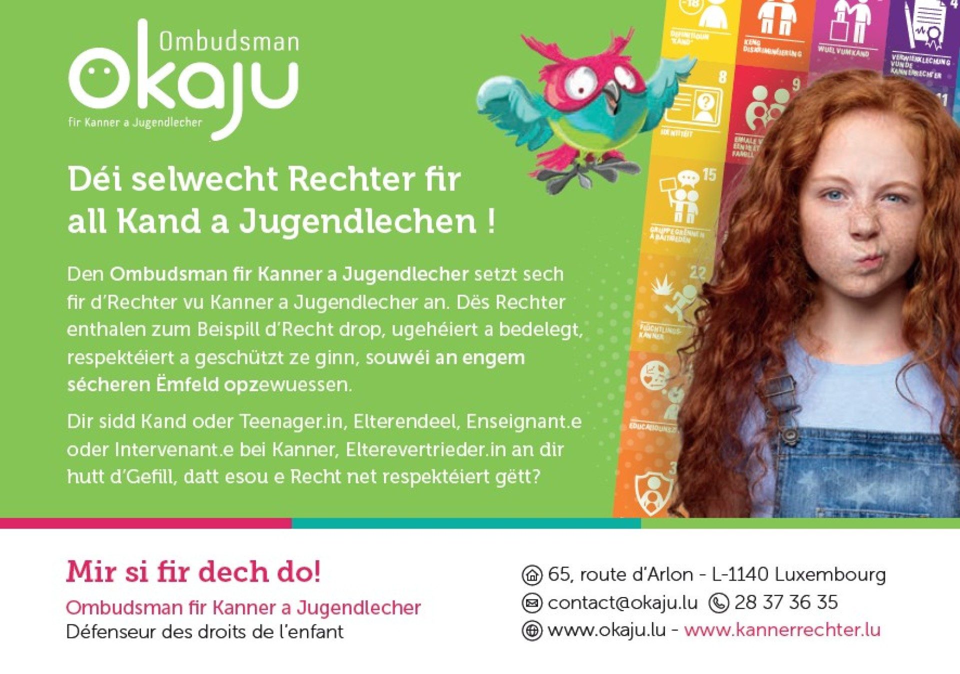 Den Ombudsman fir Kanner a Jugendlecher setzt sech fir d’Rechter vu Kanner a Jugendlecher an. Dës Rechter enthalen zum Beispill d’Recht drop, ugehéiert a bedelegt, respektéiert a geschützt ze ginn, souwéi an engem sécheren Ëmfeld opzewuessen.