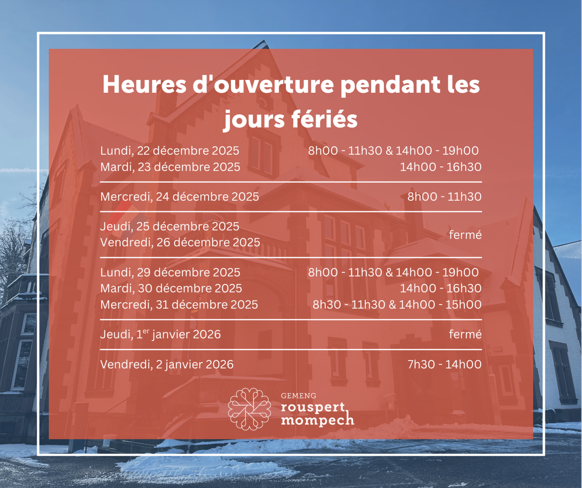 À l'occasion de la fin d'année, veuillez prendre connaissance de nos heures d'ouverture pendant les jours fériés.