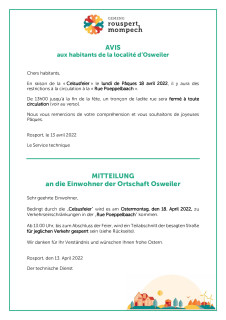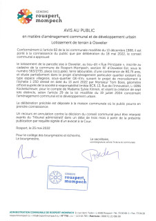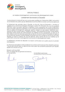 2022-10-31 Avis au public en matière d’aménagement communal - projet d’aménagement particulier concernant des fonds sis à Osweiler, au lieu-dit Rue Laangefeld